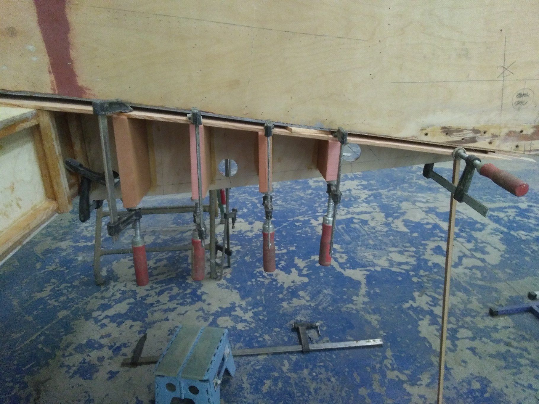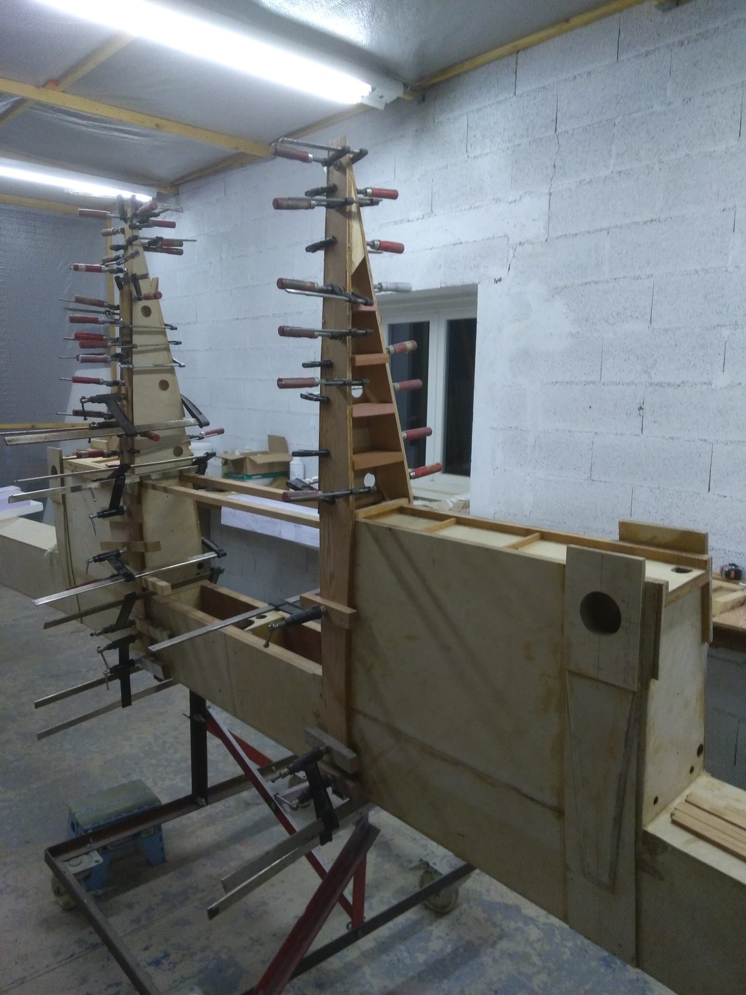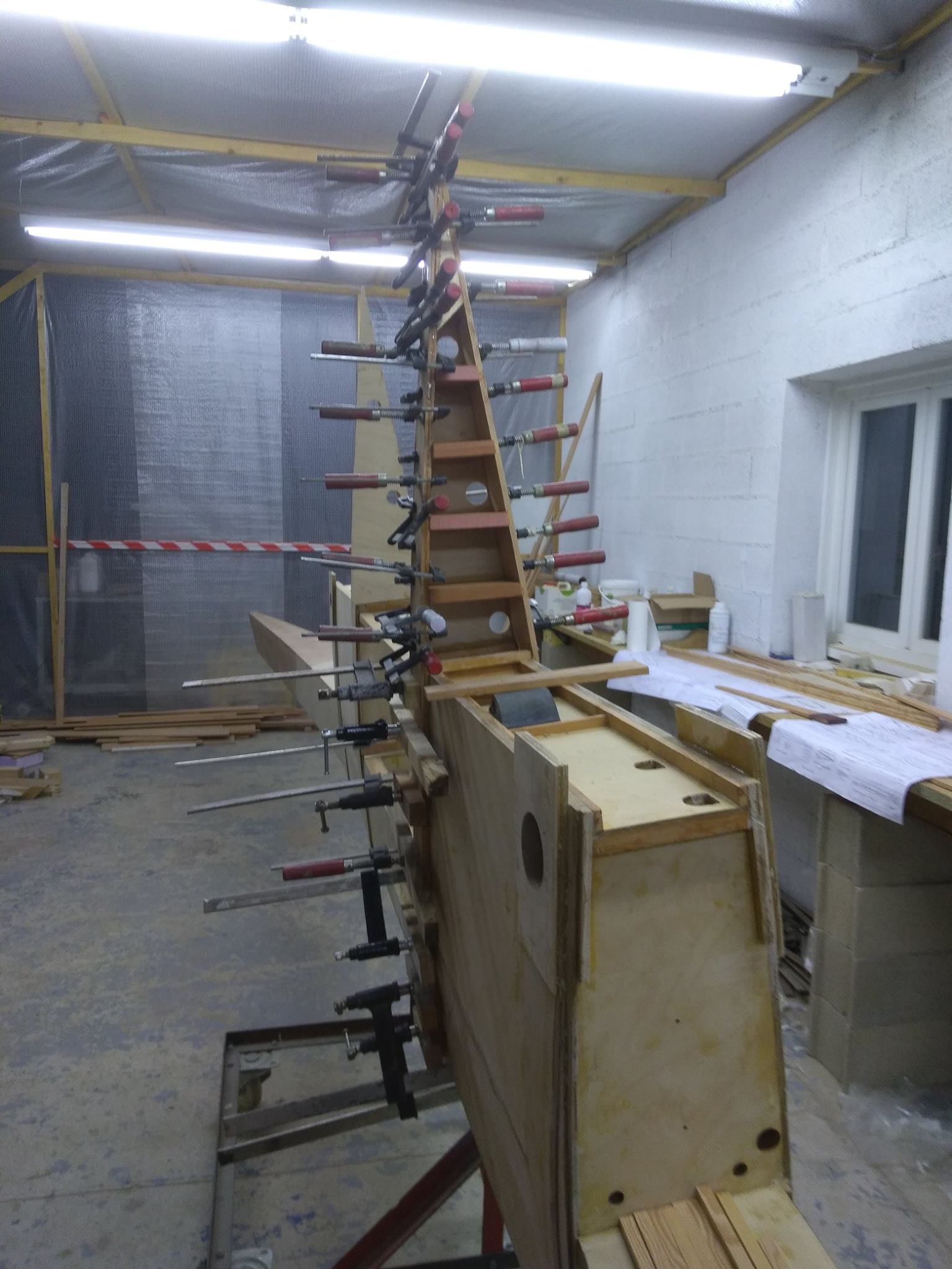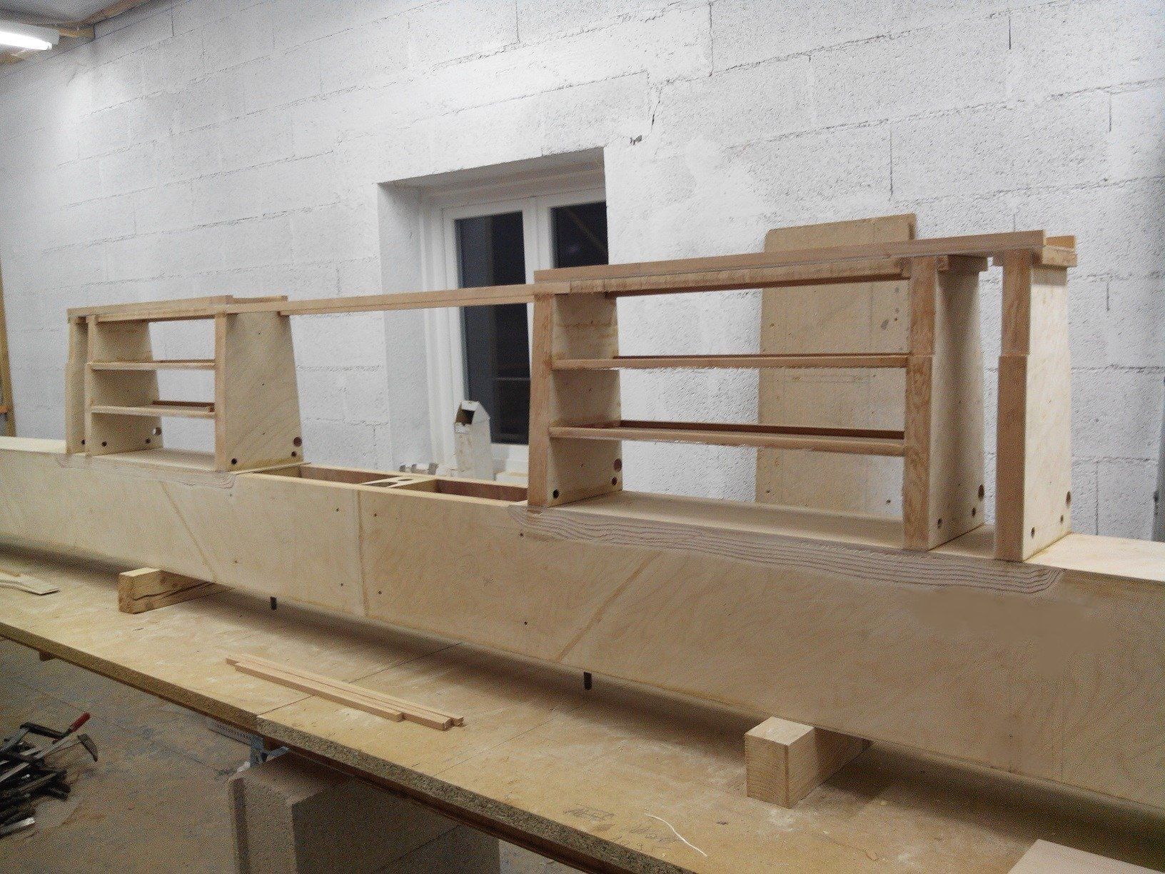 Le longeron avec début de montage des nervures N1 est de retour dans son local d'assemblage (chauffé !). Poursuite de la construction des N1, et début des N2 et FN2 (sous presse, avec les serre joints sur la table à droite)