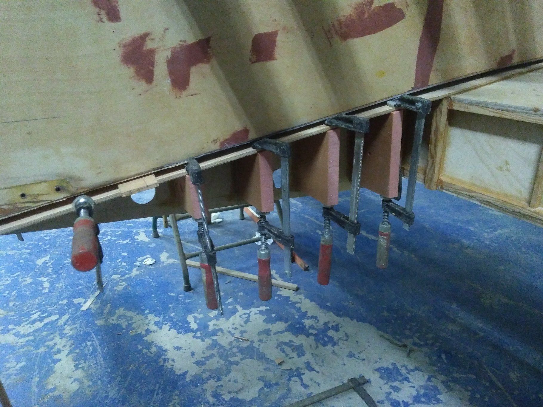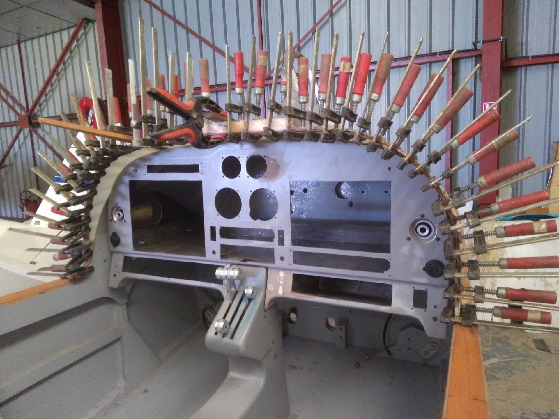 Encore un grand classique de la construction amateur : le porc-épic. Ici montage d'un renfort en lamellé collé sur la casquette du tableau de bord.